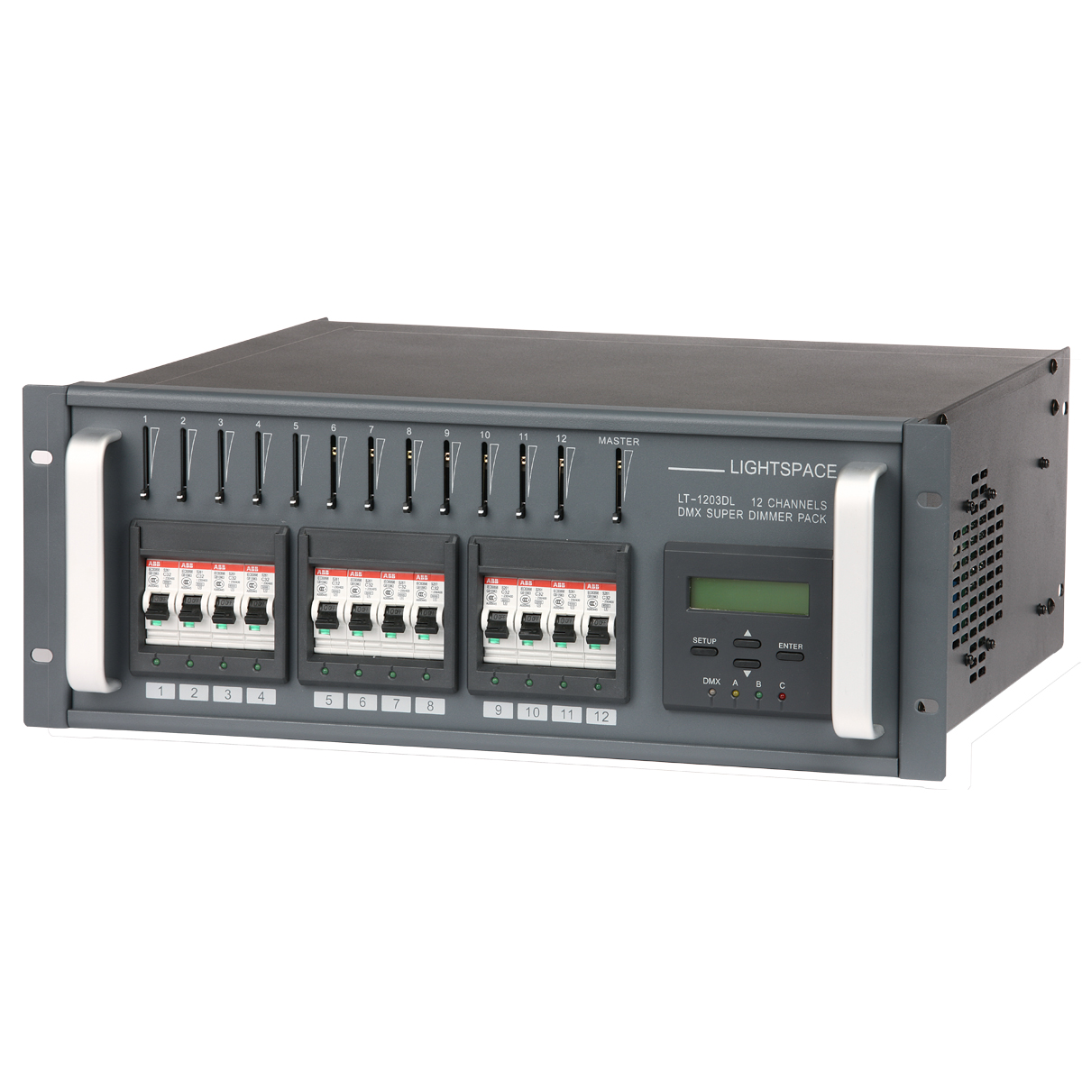 LT-1203DL 12路數字調光器可裝置于19”規范機柜和航空箱,4U機箱設想,合用作為活動裝備,小型演播廳,中小型文娛場合,及修建照明。每路設有電位器可自力利用和操縱,高速MCB及大功率可控硅,可有效掩護短路引發的可控硅擊穿。調光器內設有智能溫控電扇散熱節制,每路可設為可控縱貫,有4條調光曲線可供挑選,前面板可選多種插座情勢。