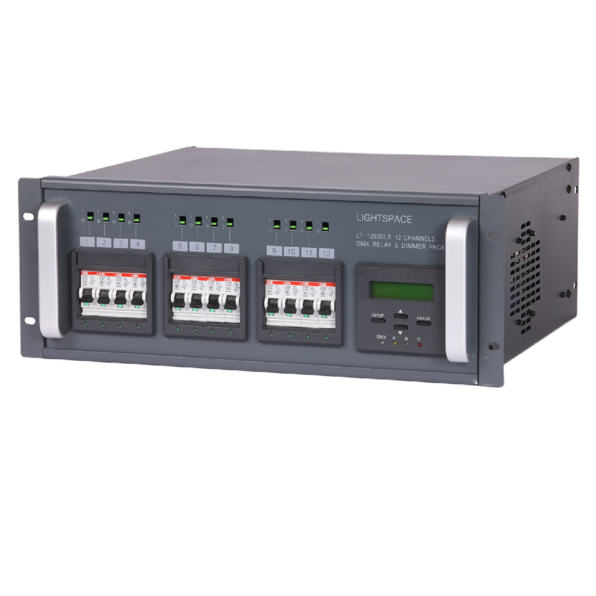 LT-1203DLR 12路調光/開關兩用數字調光器可裝置于19”規范機柜和航空箱,4U機箱設想,合用作為活動裝備,小型演播廳,中小型文娛場合,及修建照明。每路MCB過載掩護,接納磁堅持繼電器,DMX-512節制每路的通斷,每路也可手動節制縱貫的開關,每路可設為可控和不可控縱貫,前面板可選多種插座情勢。